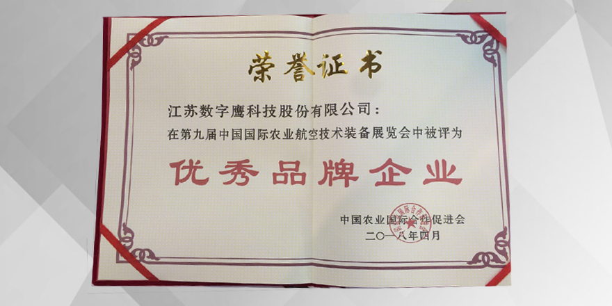 江蘇數字鷹科技股份有限公司在第九屆中國國際農業航空技術裝備展覽會中被評為“優秀品牌企業”。
