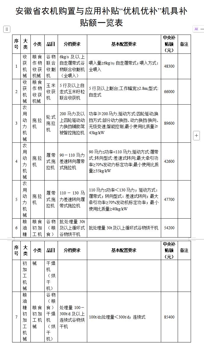 拖拉機等主流機具外,結合安徽省農業生產實際,將有助于大面積單產提升、農機應用同質化程度較高、機械化水平較高的產業和環節機具,以及有助于提高糧食和重要農產品生產機械化水平、滿足農業生產急需的不超過6類關鍵機具納入“優機優補”范圍。