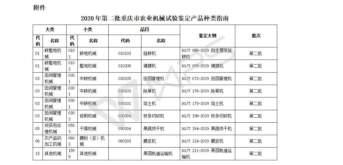 | 2020年第二批重慶市農(nóng)業(yè)機械試驗鑒定產(chǎn)品種類指南 | |||||||