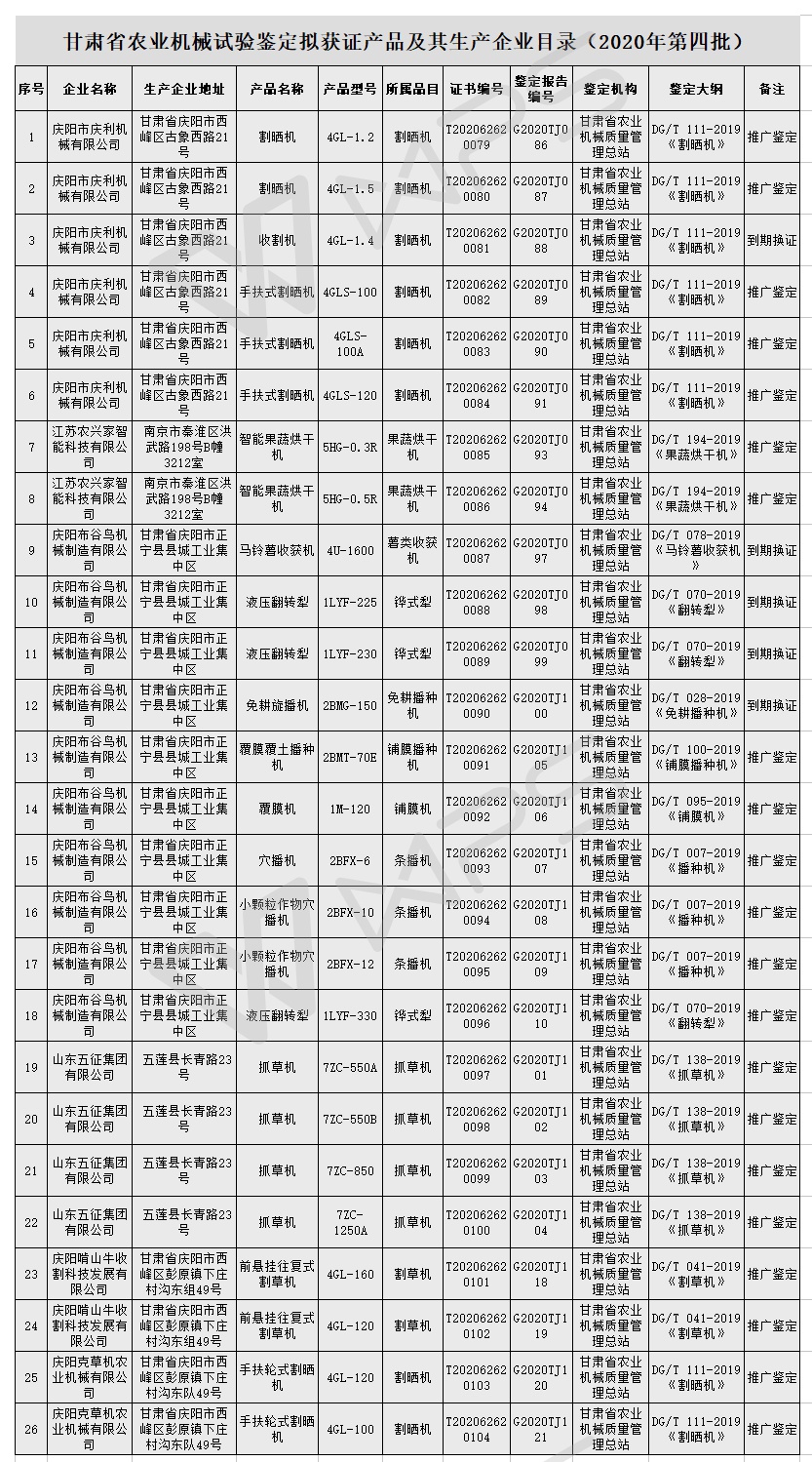 附件:甘肅省農業機械試驗鑒定擬獲證產品及其生產企業目錄(2020年第四批) 甘肅省農業機械質量管理總站