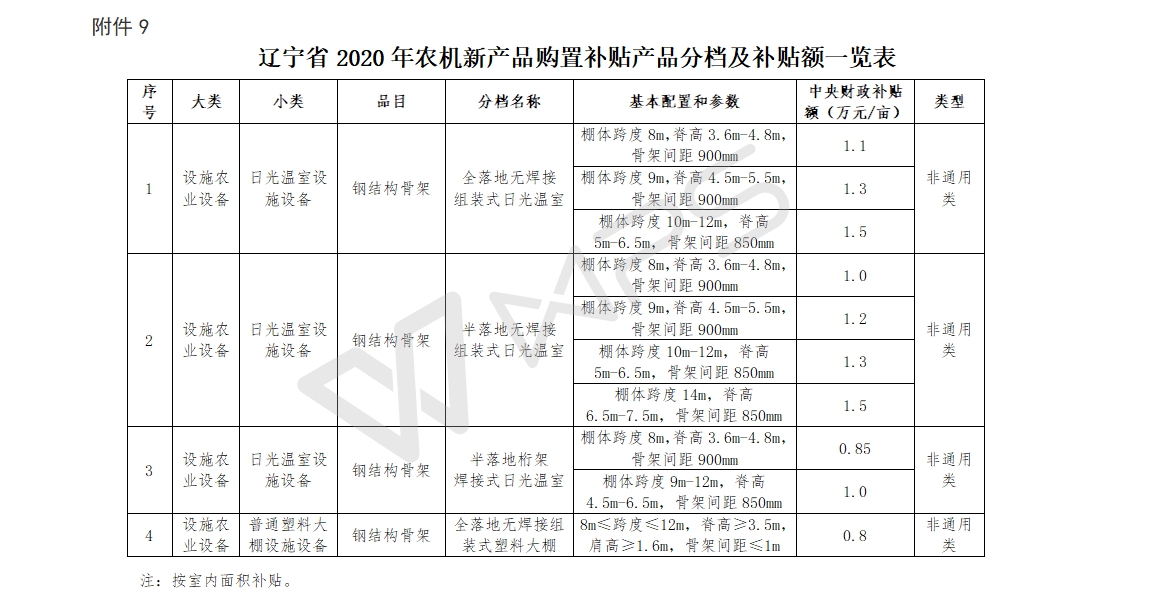 《實施方案》明確,產品補貼范圍為全省范圍內(不含大連市)涉農縣(市、區)。產品補貼對象為從事農業生產的購置鋼結構骨架的個人或農業生產經營組織。其中農業生產經營組織包括農村集體經濟組織、農民專業合作經濟組織、農業企業和其他從事農業生產經營的組織。