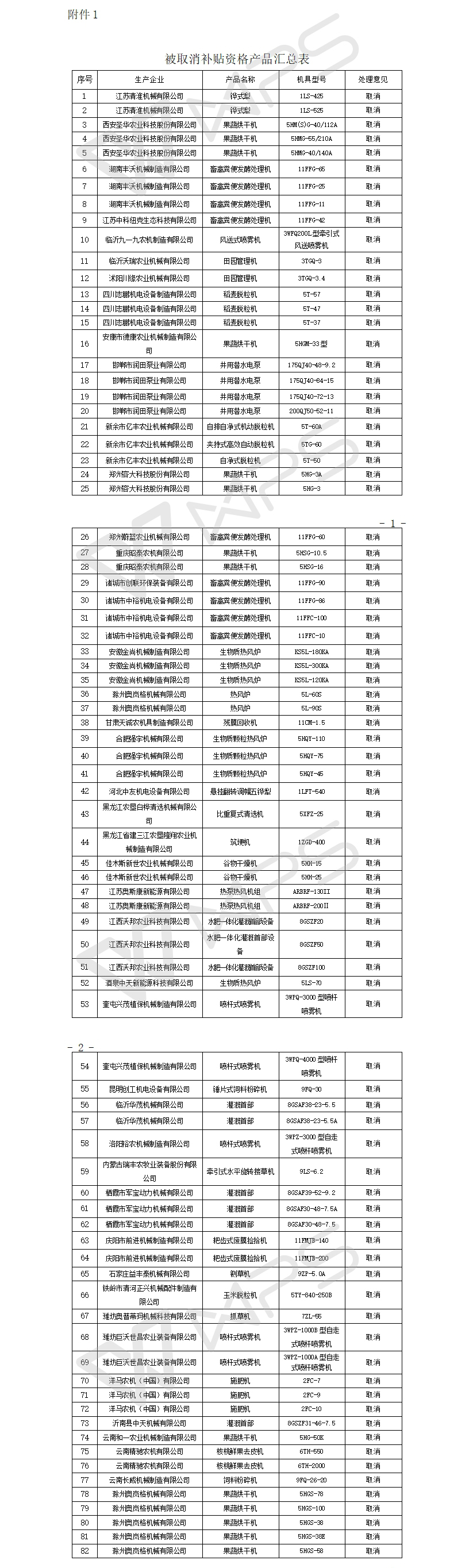 一、取消江蘇清淮機械有限公司、西安圣華農業科技有限公司等44家企業的82個產品的農機購置補貼資格