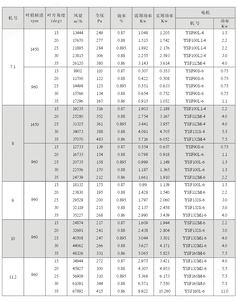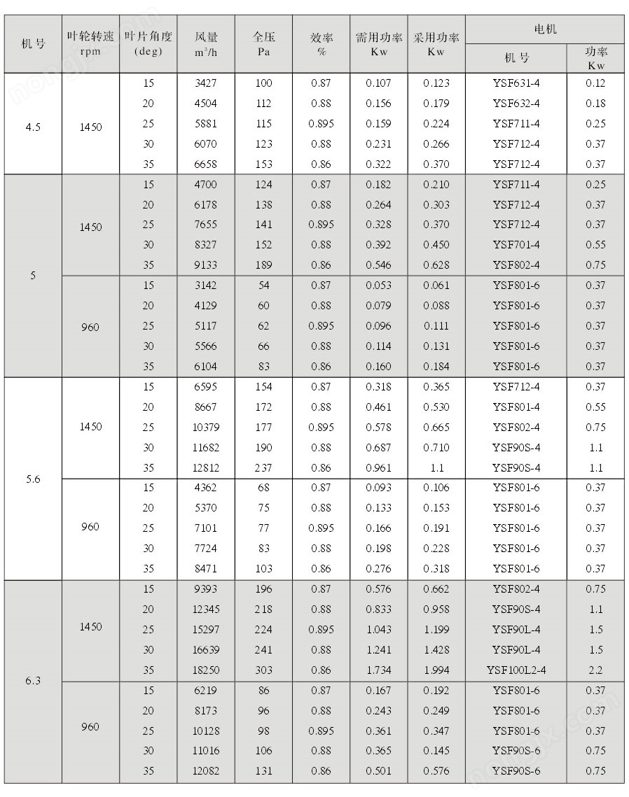 本系列風機葉輪直徑由小到大共有三十個規格,解一規格風機的葉片數都為4片,葉片角度有15℃、20℃、25℃、30℃、35℃"五種,參數范圖廣,風量826—67892m3/h,風壓39Pa—474Pa詳見性能參數表)。